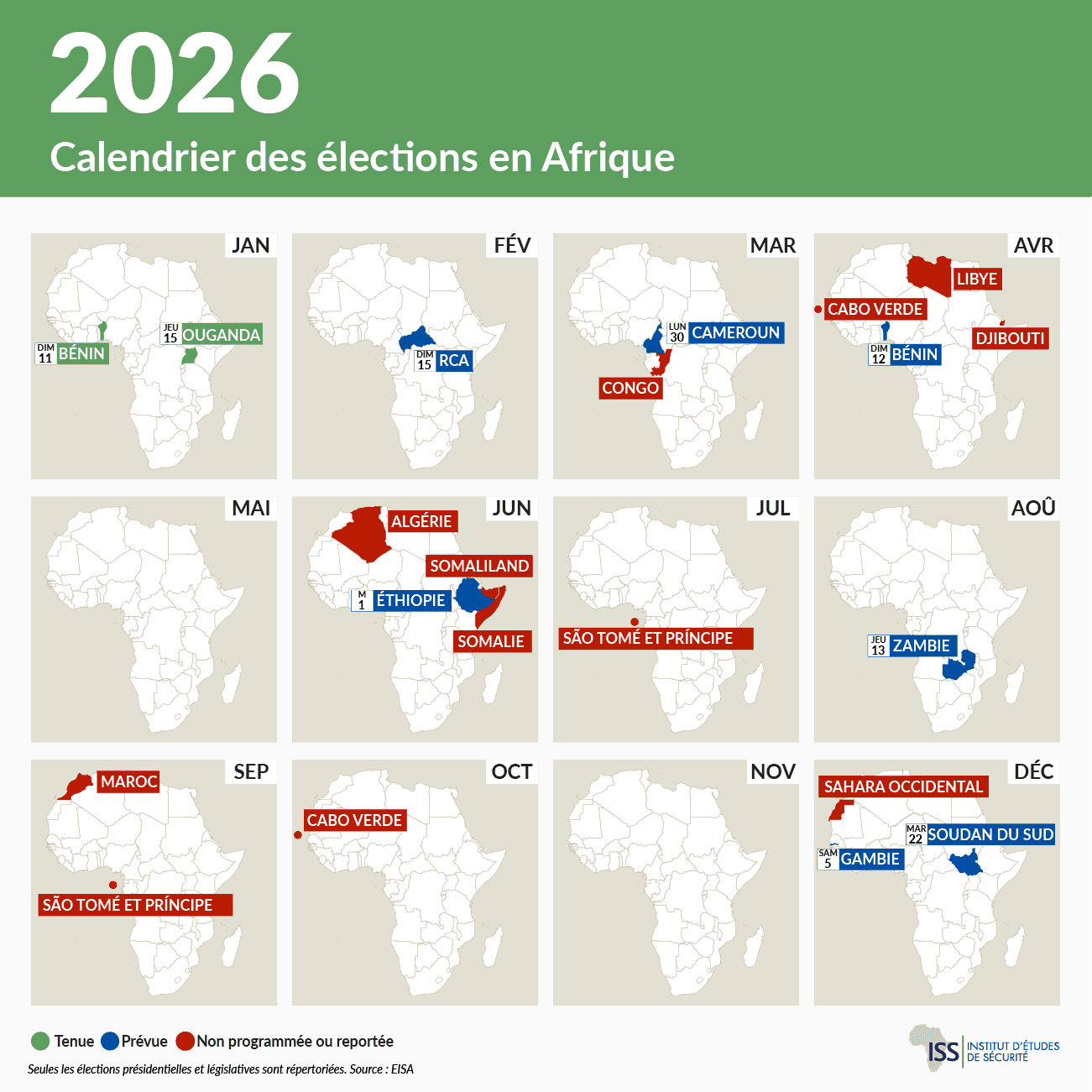 Élections en Afrique 2026 Restez informé des élections prévues sur le continent cette année. Publié le 21 janvier 2026 dans Média / Infographies Partager ceci: