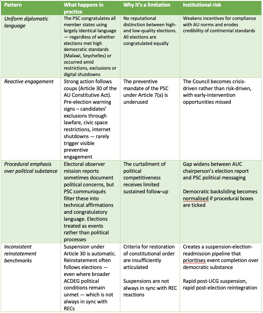 Treating elections primarily as technical events limits the Council’s preventive mandate and risks normalising democratic backsliding despite procedural compliance.