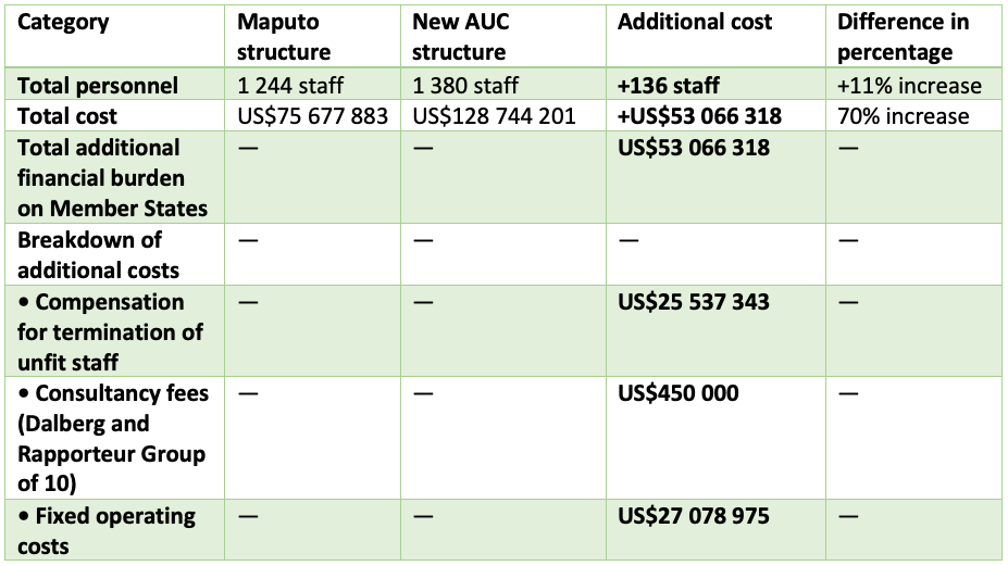 The new AUC structure’s extra costs are 70% greater than funding for the Maputo institutional arrangement