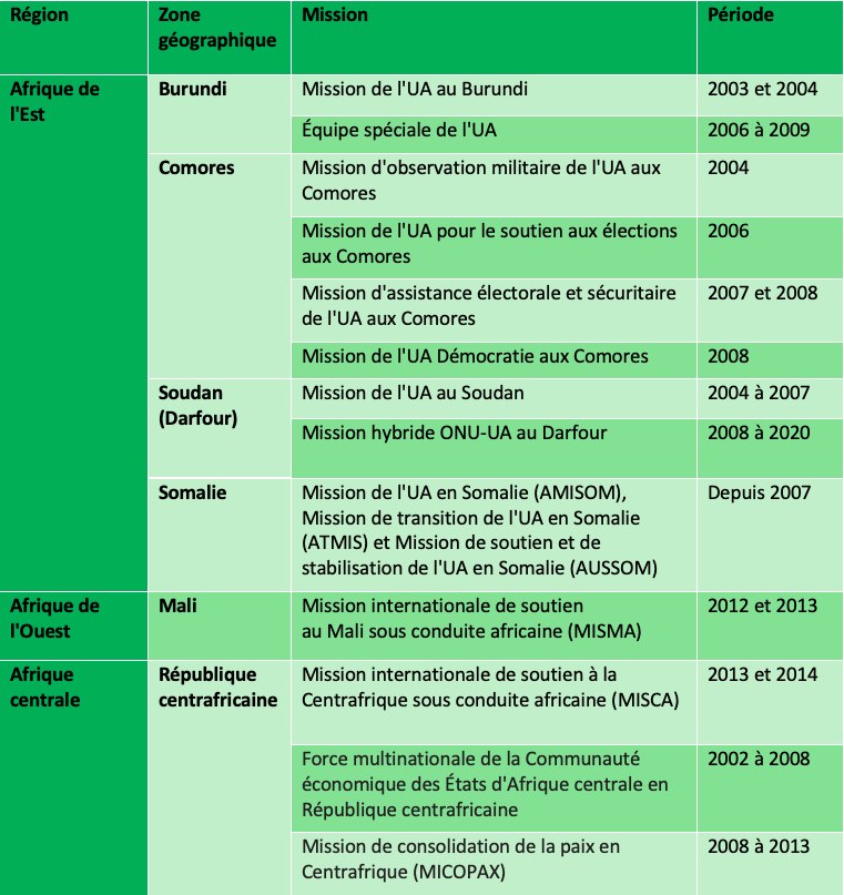 Il convient de noter que les Nations unies (ONU) ont pris le relais des missions au Mali et en République centrafricaine en 2013 et 2014. En 2016, le CPS est revenu sur sa décision d’envoyer une mission au Burundi, ce qui a rendu le Conseil plus réticent à approuver de futures missions. La mission conjointe UA-ONU au Darfour a pris fin en 2020. La seule et unique OSP de l’UA encore active était alors la Somalie, même si son déploiement dépendait des donateurs.