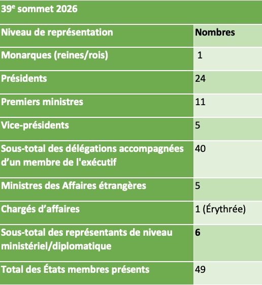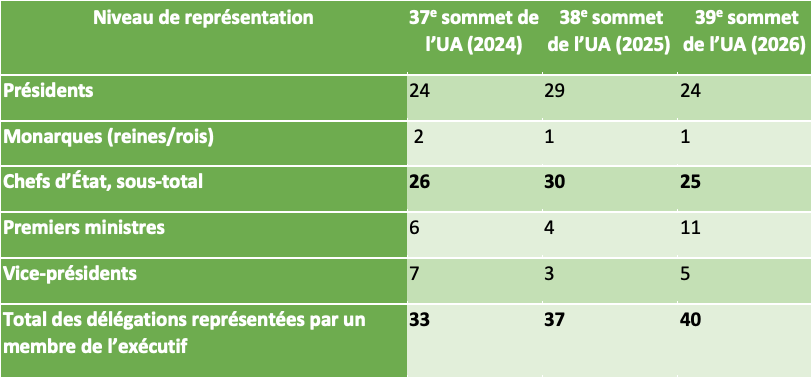 Le niveau de participation à ce 39e sommet a révélé une mobilisation politique modérée. D’après des sources de l’UA et les données compilées, 49 des 55 États membres de l’UA étaient représentés d’une manière ou d’une autre. Quarante délégations étaient dirigées par un monarque, un président, un Premier ministre ou un vice-président. Environ 51 % des membres actifs étaient représentés par un président ou un roi.