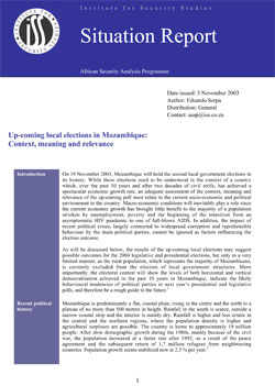 On 19 November 2003, Mozambique will hold the second local government elections in its history. While these elections need to be understood in the context of a country which, over the past 10 years and after two decades of civil strife, has achieved a spectacular economic growth rate, an adequate assessment of the context, meaning and relevance of the up-coming poll must relate to the current socio-economic and political environment in the country. Macro-economic conditions will inevitably play a role since the current economic growth has brought little benefit to the majority of a population stricken by unemployment, poverty and the beginning of the transition from an asymptomatic HIV pandemic to one of full-blown AIDS. In addition, the impact of recent political crises, largely connected to widespread corruption and reprehensible behaviour by the main political parties, cannot be ignored as factors influencing the election outcome.